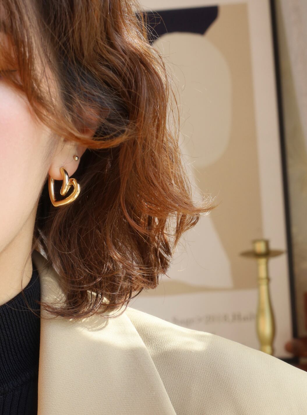 トレンドのハート♡モチーフピアスです。横から見ると耳たぶをハートで挟んでいるように見えます。シンプルな大人デザインなので、ハートは苦手という方でも気軽に使って頂けるかと思います。