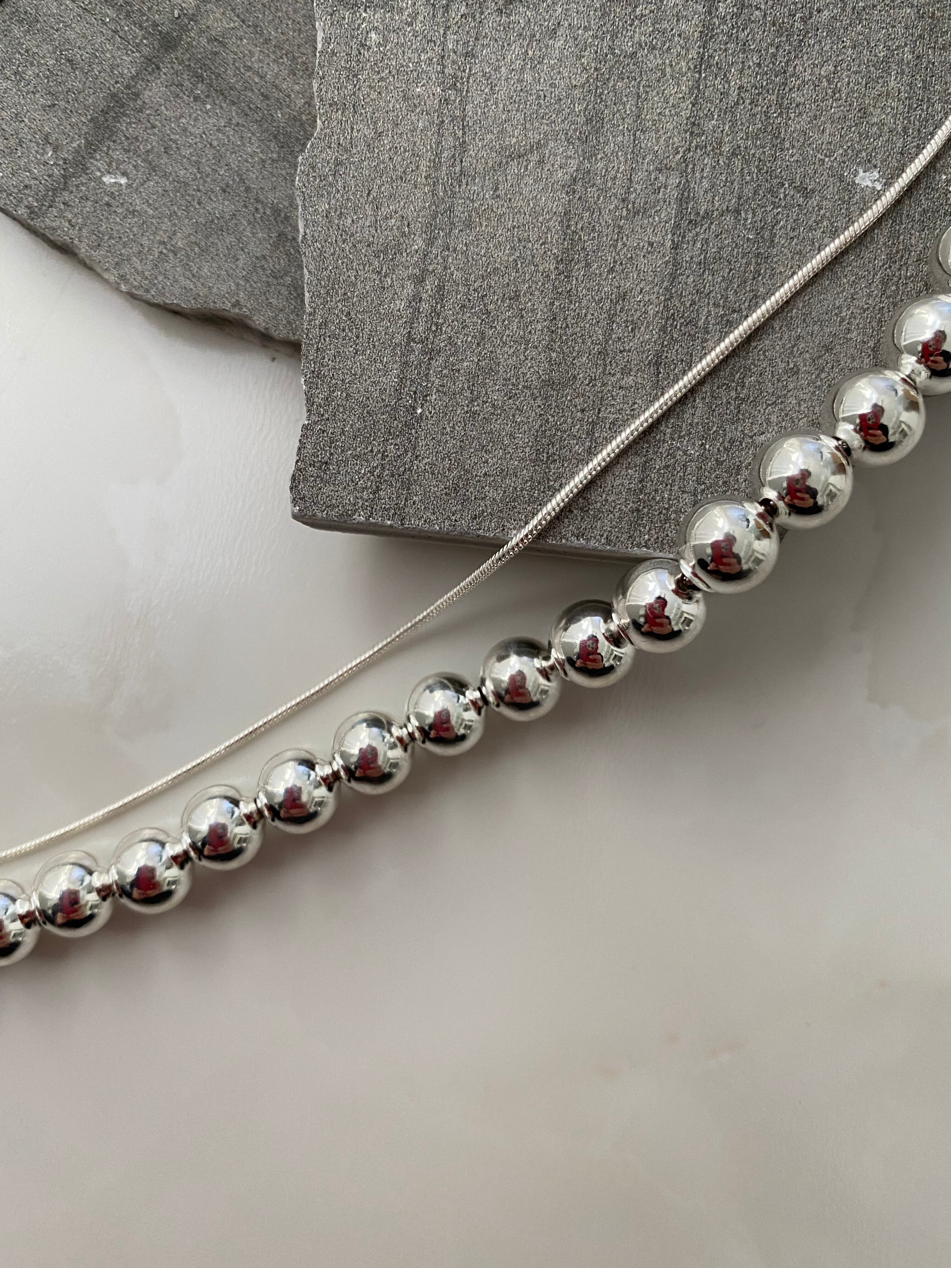 メタルボールネックレスと、シルバーチェーンネックレスの2連Setです。こだわりは、いづれも白っぽく輝くシルバーを使用し、直径8㎜の少し大ぶりのメタルボールは光の当たり方によってはパールの様にも見えます。長時間付けても肩が凝らないよう、1番軽い素材を選定しました。カジュアルにもお出かけにも着用して頂けるかと思います。また、別々に着用することも可能なので、気分によって3通りの使い方にアレンジできます。