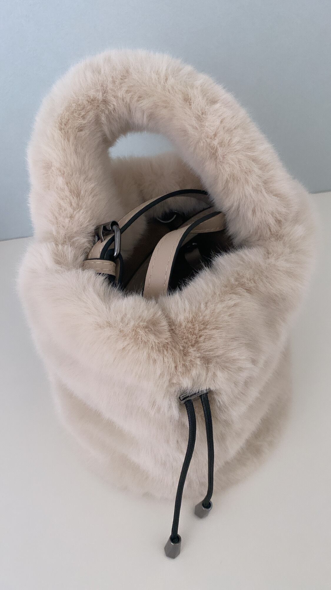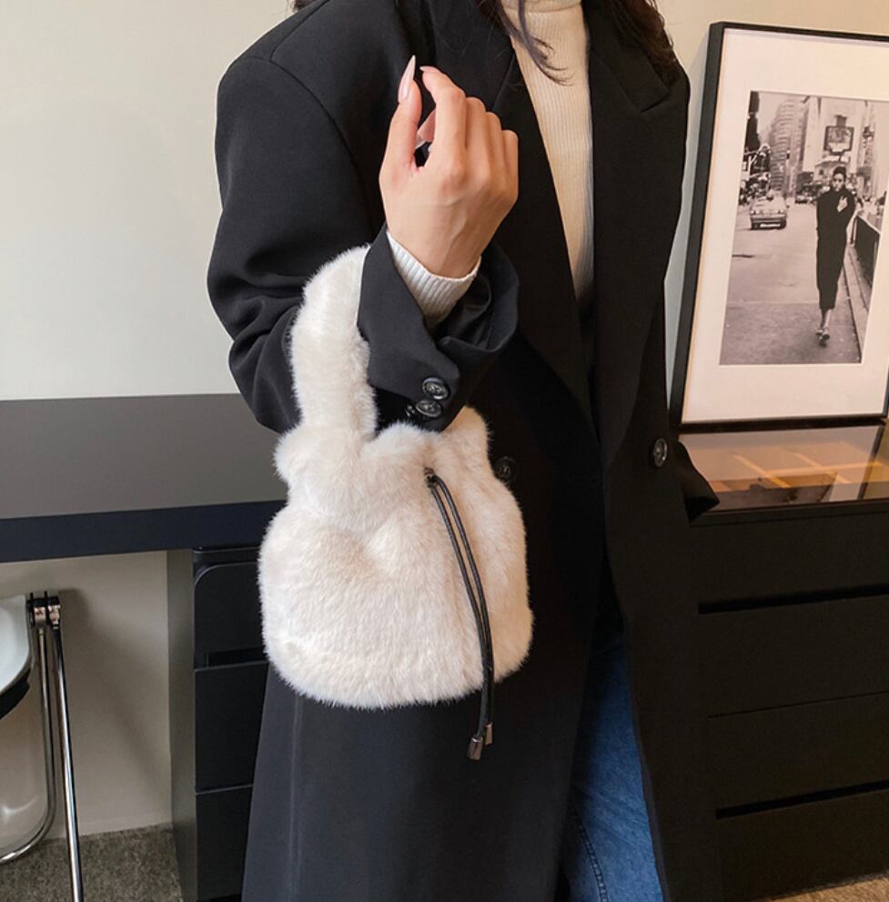 ふわふわもこもこのかわいい4way Moko bag。手触りが本当に気持ちいいです。とても軽く、持ち手も太めでふわふわ感触が柔らかいので長時間持っていても苦になりません。持ち方は4パターン。口を開けたまま手持ち、口を閉じて巾着手持ち、それぞれのパターンでショルダー持ちにもできます。ショルダーストラップの金具は少しブラックがかったシルバーで高級感があります。